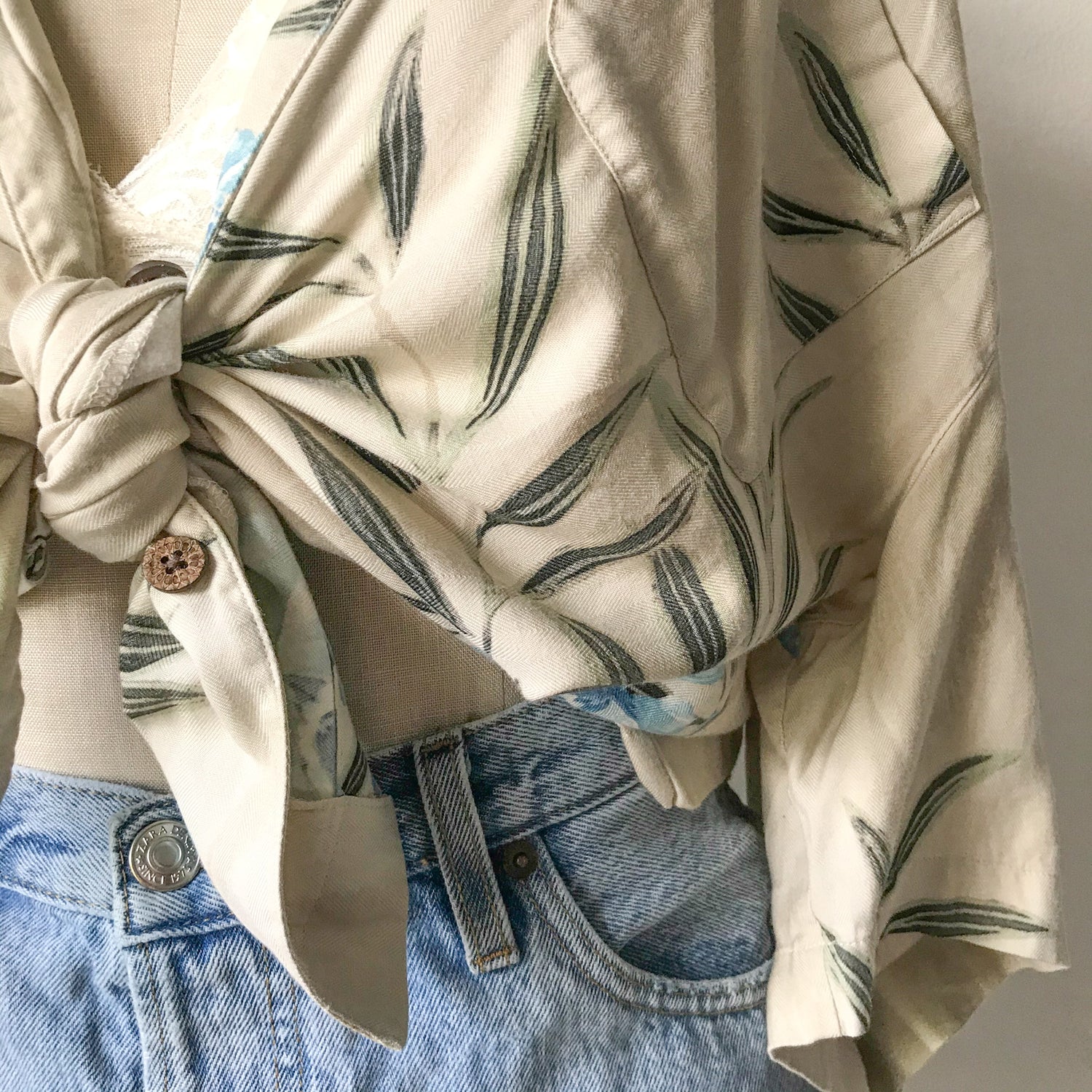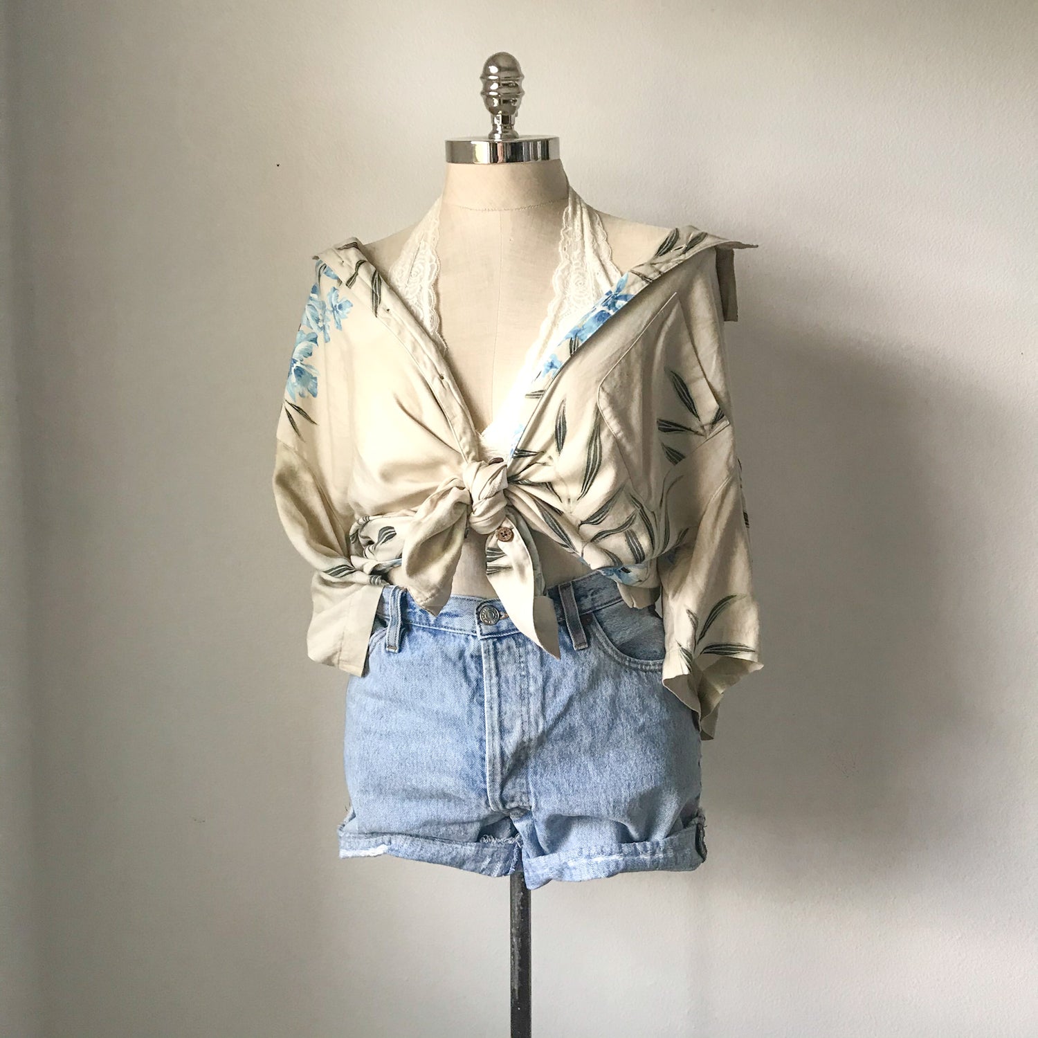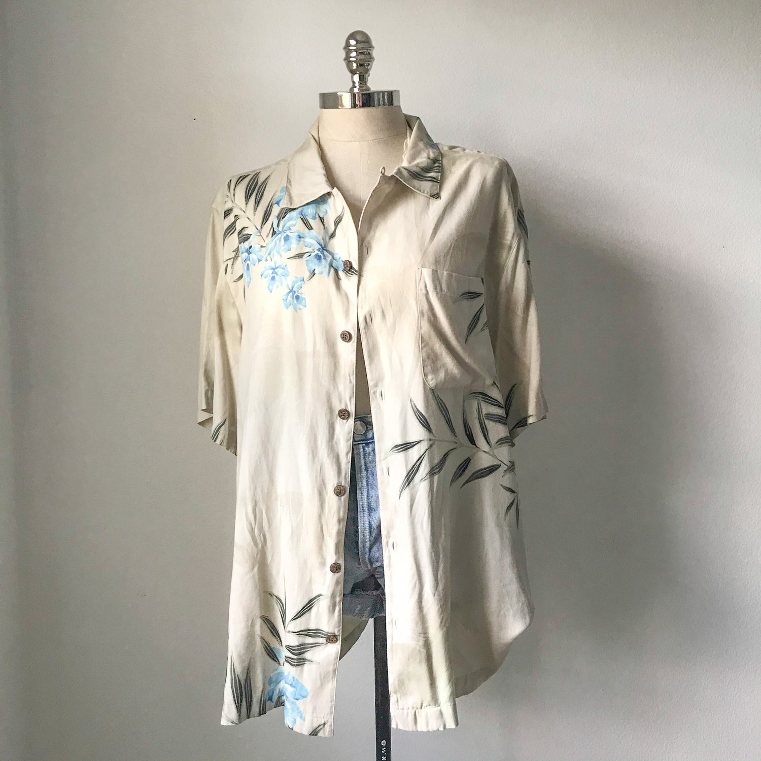 Cream floral Hawaiian print short sleeve button-down top. Silk and rayon blend.
