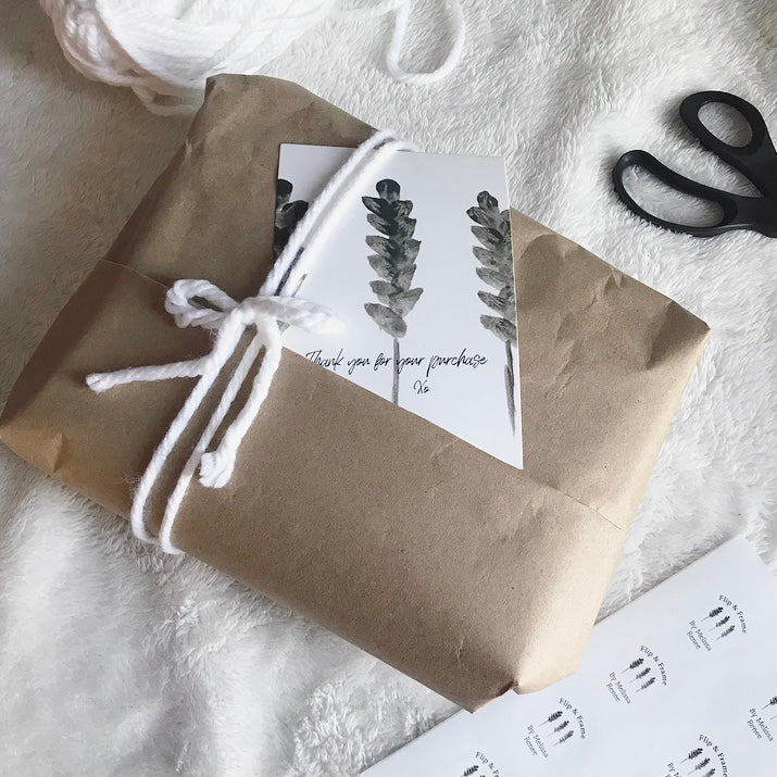 50 Flip & Frame Pampas Grass Thank you cards. Designed with sustainability in mind. Your customer can re-use for the same purpose or flip & frame. Add the special touch while lessening the amount of paper waste in your product packaging.